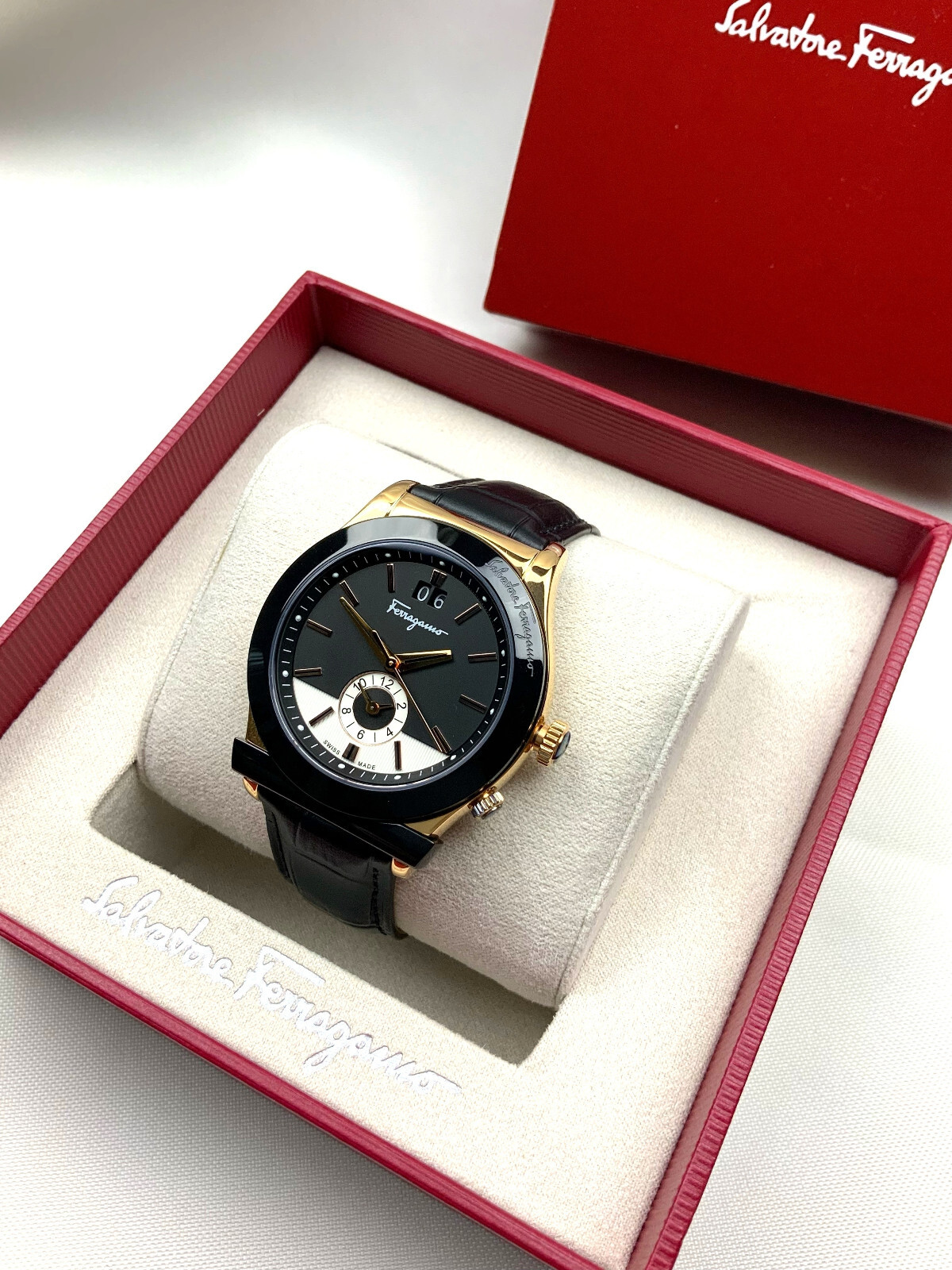 Salvatore Ferragamo ゴールド ブラック 時計 Salvatore Ferragamo 1898 Black Dial Black Leather Strap